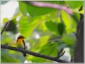 ヤマガラが4羽ほどやって来て「ツツニー、ツツニー、ニィーニィーニィー」と騒ぎ出したのが気に障ったようで、寛ぎの様相が一転、飛び出して高い葉の茂った場所で「ブブブ、ブブブ」と警戒音を発し始めました (^^ゞ 15分程そのような状況が続いた後、ヤマガラの傍若無人な振る舞いに諦めたようで、キビタキは去っていってしまいました (T_T) そんな格闘中にも、キビタキはチャッカリ毛虫を捕獲して、こちらとも格闘していました (^^ゞ