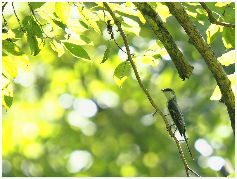 沢沿いの林道:アオゲラ、オオルリ(ど逆光でシルエット)、キビタキ(雌)、サンコウチョウ(尾だけ)、サンショウクイ、センダイムシクイ、ノジコ