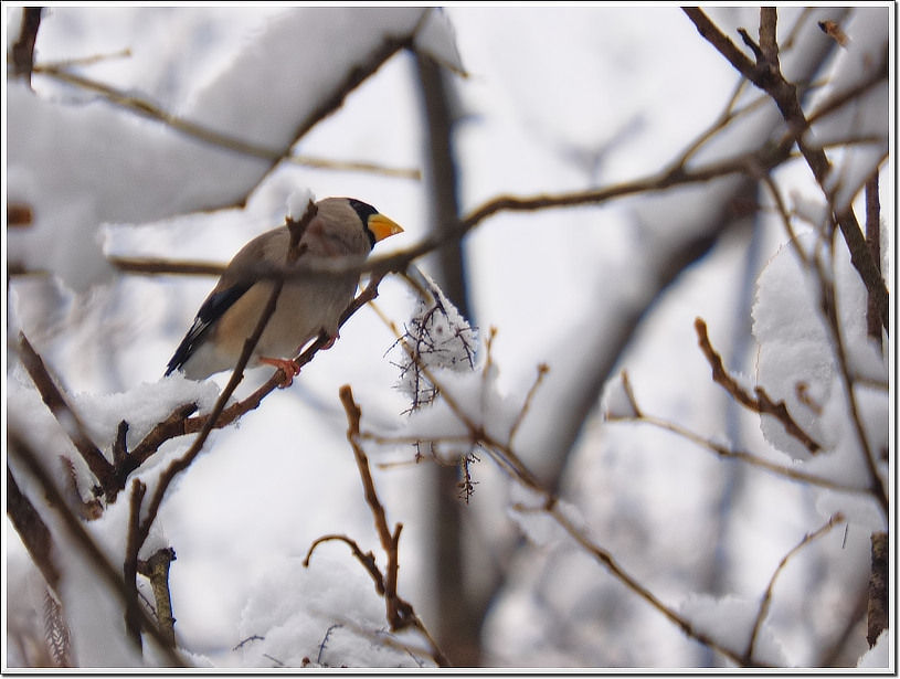 例の独特の声が聞こえたため、ちょっとビックリしながらもパチリとできたイカル。 雪の時期にはコノ辺りからは居なくなるものと思っていました (^^♪