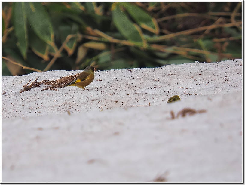雪上で採餌していると思われるカワラヒワを撮っている時に、近くにジョウビタキが居る事に気付きました。 が… 速攻で飛ばれてしまいました (T_T) まぁ~UPできるようなモノでは無いのですが、やっと里山公園でも姿を見られたと言う記録ってことで… (^^ゞ こうやって見ると、別名が紋付鳥って言うのが、よく分かります (^^ゞ 来週に期待を繋げる1枚かなぁ~…